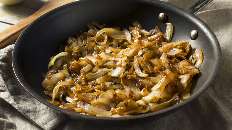 "If you cut against the grain, the onion slices tend to break apart more easily, which is great when you want them to blend into a dish," she said. "Cutting with the grain gives you rather intact pieces, which is perfect for when you want to showcase them on top of something, like on a burger." An example of when you may want your caramelized onions to blend in more with your dish and therefore cut against the grain is when you're including them in sauces or soups. Cutting with the grain to maintain their texture, on the other hand, will be best whenever you're using them as a topping, just like Sadler's burger example or our decadent French onion burger recipe.