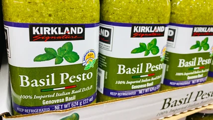 What makes Costco's pesto unique is that it's D.O.P.-certified and produced in Italy. The abbreviation stands for "Denominazione d'Origine Protetta," which translates to "protected designation of origin." This is a strictly regulated Italian label that means the product is only made with local ingredients in the traditional fashion. It's best known for famous products like Prosciutto di Parma or wines like prosecco, but covers many different Italian foods. The label ensures the highest standard for products, based on the idea that the regional climate and growing conditions produce the best versions of things like olive oil and basil. And in the case of Costco's version, it's not just D.O.P. certified, but made with Genovese basil from the birthplace of pesto.
