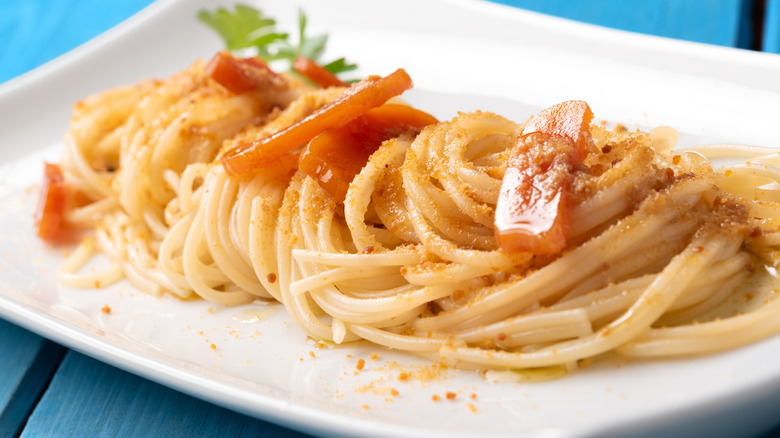Sardinian spaghetti con la bottarga showcases the island's bold, robust bottarga as the star ingredient. To make it, as Bourdain explains, "Heat up good olive oil, drag a clove of garlic and a pepper through the oil — just a wave — then add slices of bottarga, simmer until they start to fall apart, add your cooked spaghetti, toss gently, add a sprinkling of powdered, dried bottarga, and oh my god is it good. Garnish with more bottarga if you like! Go ahead!"