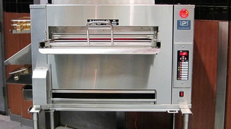 Not so at Burger King. While the flames are definitely there, the restaurant chain actually uses a commercial broiler to prepare its flame-grilled patties. BK has used a commercial broiler right from the get-go, and updated the models along the way. Today, it's not just any broiler – it's a proprietary one that was developed specifically for the chain. The chef pops a bunch of frozen patties onto a tray in one go, slides them into the broiler, and then the enclosed flames and circulating heat cook them to flame-grilled perfection. They pop out into a tray on the other side, ready to be assembled into whatever burger the customer has ordered.