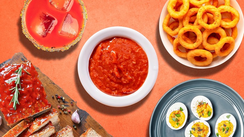 Classic cocktail sauce is typically reserved for shrimp, though it was first paired with oysters, not shrimp. Its ingredient list is dynamic and multi-dimensional, as it covers the entire spectrum of sweet (ketchup), savory (Worcestershire sauce), spicy (hot sauce and horseradish), and acidic (lemon). This is what makes it such a great foil to relatively neutral (and salty) proteins like shrimp and oysters. Though, cocktail sauce has a ton of utility outside of just seafood. If you're looking for a way to make use of the rest of the bottle of grocery-store cocktail sauce, check out some of these fun and creative suggestions.