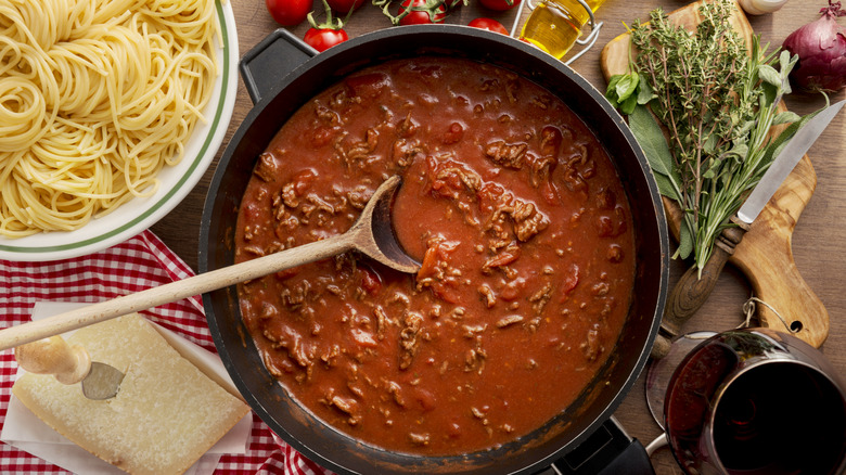 Have you ever looked at your tomato sauce and thought, "Yep, not fiery enough?" Well, after you try adding a little splash of cocktail sauce to it, you may think differently. Cocktail sauce is an incredibly dynamic ingredient, which is why it can add a unique edge and enliven a jarred pasta sauce. If you're opting for a sauce with a tomato base, like a ragù or a bolognese, you can add a little dash of your favorite cocktail sauce and season as necessary.