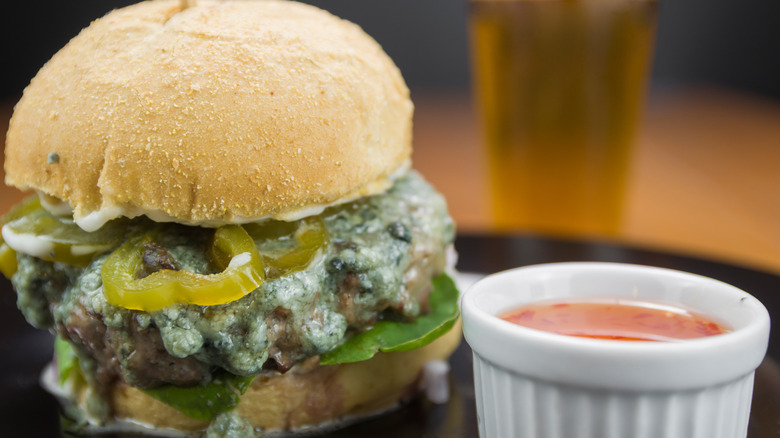 There are tons of store-bought sauces to elevate your burger out there, from pesto and garlicky toum to ranch dressings galore. Cocktail sauce may not have been one that you've considered yet — though it might be about time to try it. Cocktail sauce is often made with ketchup, so it's easy to see the potential trajectory for how it can be used in lieu of plain ketchup on your burger. Plus, the sharpness of the horseradish will cut through the richness of whatever patty variety you opt for, whether poultry, beef, or plant-based. Add some fried onions for crunch or stick some bacon in it to make the cocktail sauce stand out even more.