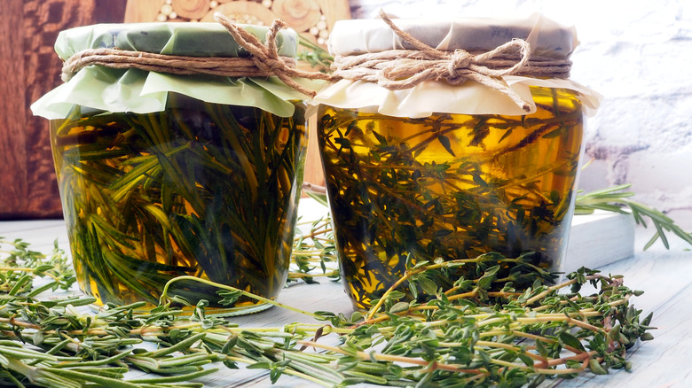 Technically, the oil left over from sun-dried tomatoes is already an infused oil since it absorbs the flavor of the fruit itself. As we've established, sun-dried tomato oil is an incredibly versatile product in and of itself — but that doesn't mean it can't be spiffed up even more. Remember those fancy-schmancy-infused olive oils with shallots, thyme, jalapeños, and other ingredients marinating in them that can set you back $10 for a 4-ounce bottle?
