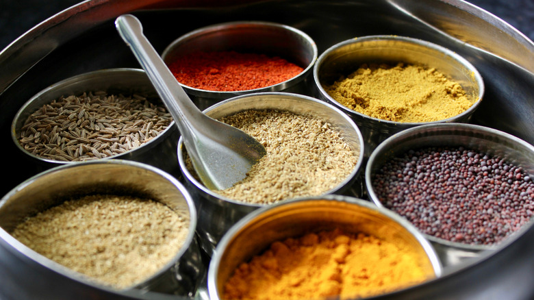 If you get tired of perpetually finding duplicates in your spice cabinet or having to search in its back recesses for something as simple as black pepper, you need a masala dabba — even if it's not for cooking Indian food. A masala dabba is a spice container, usually circular and made of brass or steel, that is traditionally used to store a cook's most frequently used spices. The most common style of dabba contains the cutest spoon imaginable and seven small bowls for spices like turmeric, ground coriander, cumin seeds, and garam masala. That said, many models feature 12 compartments.