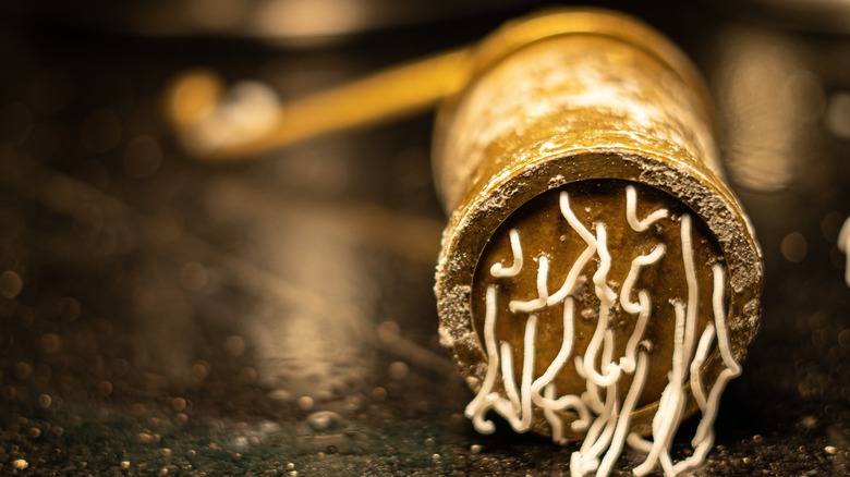 A sancha machine may look and sound quite fancy, but it is actually quite affordable and simple to use. You will need one if you want to try your hand at homemade snacks like sev, chakli, and gathiya, perhaps in honor of Diwali. Sancha machines are also used to make idiyappam, a South Indian specialty that is reminiscent of a cake of noodles. Similar to a pasta machine, a sancha machine can process dough into a multitude of shapes by grating it through discs with holes in various formations. Usually, this dough will then be fried to a crispy, golden perfection and served alongside a cup of chai.