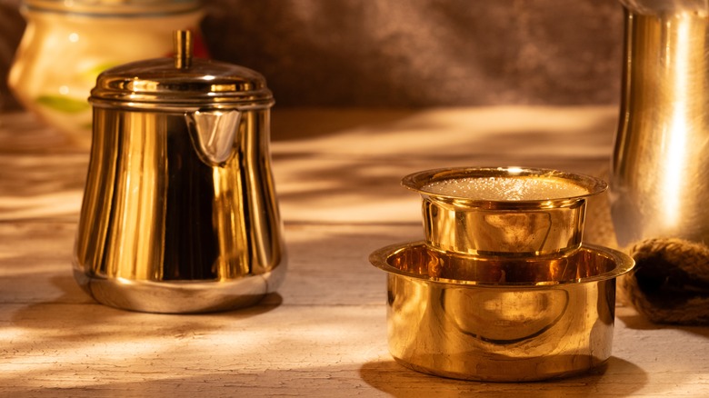 Along with milk and either sugar or jaggery, you will need coffee powder (which is not the same as instant coffee) to make this famous beverage. Sometimes such coffee powders contain a little chicory for a sweet twist. Then comes the filter itself. Usually made from brass or steel, a South Indian coffee filter differs slightly from other filters like the French press in both form and operation; in fact, it can take up to 15-20 minutes to percolate your coffee. Once brewed, the coffee is poured into a brass dabra set. By pouring the beverage from one cup into the other, then repeating several times, a slightly foamy texture can be achieved.