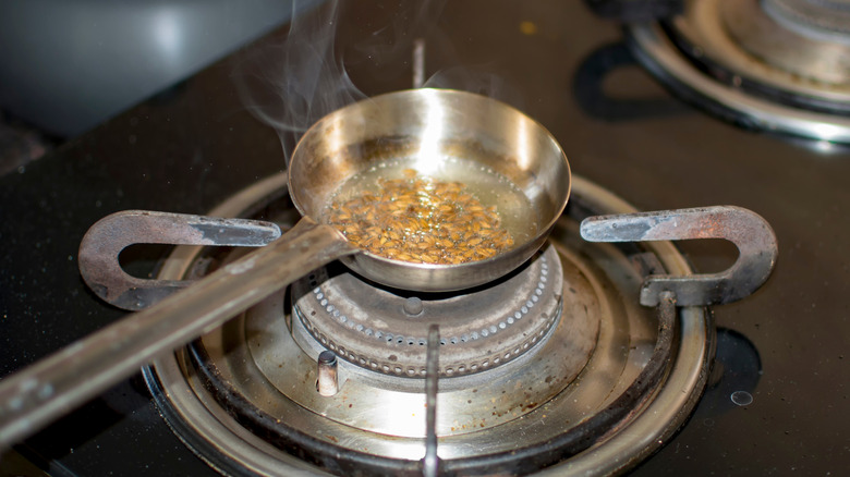 A tempering is an aromatic and flavorful mixture of spices cooked in oil, butter, or ghee. A tadka spoon is designed to completely envelop spices in your chosen fat source because when spices are cooked in some kind of fat, their flavors truly start to pop. Temperings are typically added at the end of recipes for dishes such as dal, sambar, and chutney; that's because incorporating ingredients like mustard seeds, cumin seeds, garlic, hing, and curry leaves towards the end of a dish ensures more pungency. Don't just throw all your tempering ingredients into a tadka spoon at once, though. There is a specific order you should follow: Start by heating the fat source, then (one at a time) add whole spices, freshly chopped ingredients like garlic and ginger, ground spices, and, finally, fresh herbs.