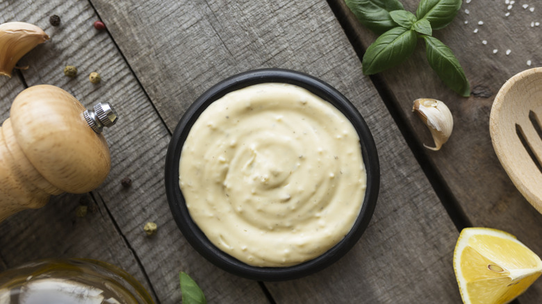 Alternatively, you can use an immersion blender and place your garlic, egg yolks, salt, and basil leaves into a measuring cup. Add Dijon mustard or fresh lemon juice for extra flavor, or season with ground black pepper and cayenne pepper for a spicy element. Put everything in the measuring cup, and blend in one-second intervals until the bottom looks emulsified. Then, blend the rest of the mixture for a few more seconds until you have a thick, well-combined sauce. When it's ready, there shouldn't be any remnants of oil. Now, spread onto your favorite sandwich and enjoy!