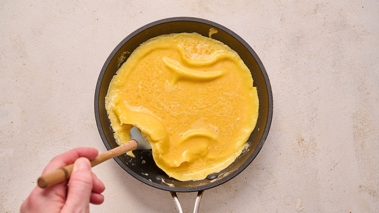 - As the eggs begin to set, lift the edges of the omelette up and allow liquid to run underneath. Repeat until no liquid remains.