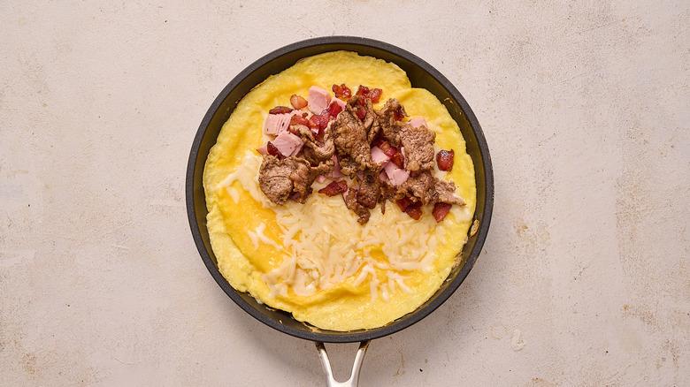 - Add the ham, cooked bacon, and cooked steak to one side of the omelette.