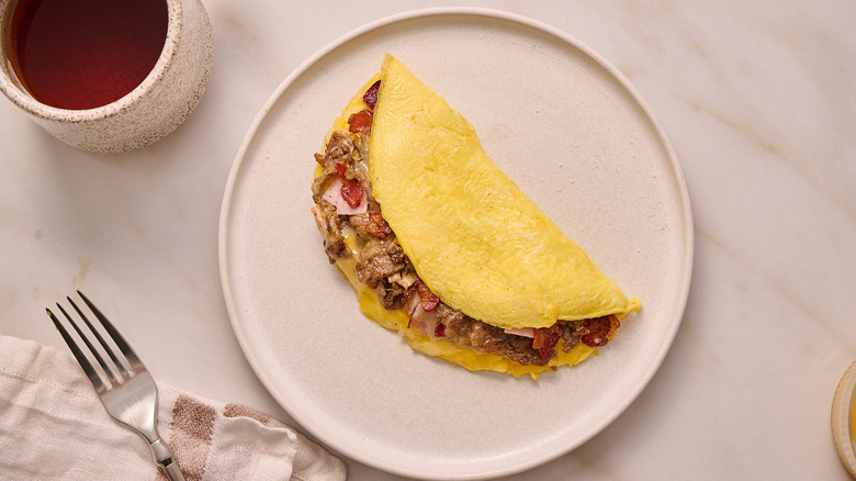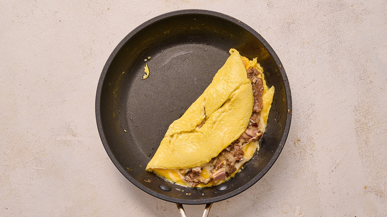 Recipe developer Michelle McGlinn (who, yes, also orders meat-lover's pizzas) crafted the perfect meat-heavy breakfast all nestled between the fluffy layers of an egg omelette. Crispy bacon joins seared shaved steak and cubed pieces of cured ham for an omelette that is perfectly meaty without being overwhelming. Each meat has a different texture and flavor while being compact enough to be folded into an omelette and served in 15 minutes or less. This omelette can be served on its own or with a side of hash browns for a quick, hearty breakfast — no side of bacon needed (though it wouldn't hurt).