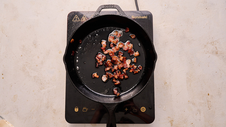 - Add the bacon pieces and cook until crispy, about 5 minutes.