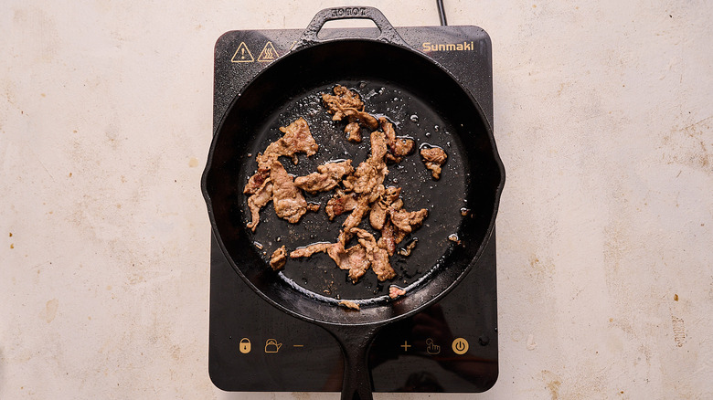 - Add the shaved steak to the skillet and cook until browned, about 5 minutes. Season with ⅛ teaspoon salt and pepper.