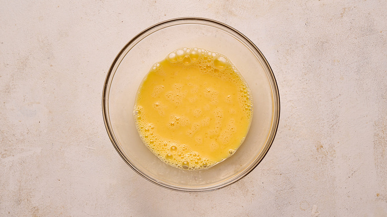 It may be tempting to stir the eggs only until they are combined, but with omelettes it's especially important to whip the eggs until fully combined and even a little frothy. The reasoning is twofold: Separated eggs and whites will cause an uneven, spotty omelette, possibly with a few lumps and bumps, but also, whisking the eggs will incorporate air into the mixture, leading to a fluffy omelette. When whisking, whisk until bubbles form and the egg runs smoothly off of the whisk.