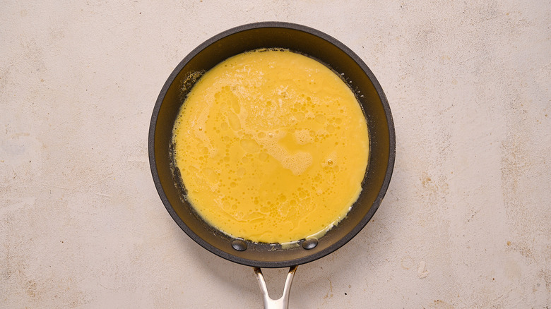 There are a few tips to follow to make a perfect omelette. First, use a nonstick pan between 6 and 8 inches in diameter, or about the same width as your finished omelette. Not only will the omelette be the same size as your pan, but the nonstick surface will allow the eggs to set without sticking. Next, use whole milk or cream in the egg mixture, which increases the egg's fat content and makes a creamier curd. Finally, and most importantly, in order to make a perfectly fluffy omelette, you'll need to beat the eggs well.