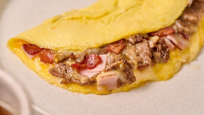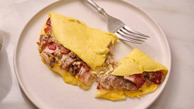The meats you'll need for this recipe are bacon, shaved steak, and ham. Bacon is easy enough — any thickness and cut will work here, so no need to choose between center or thick cut. If your store doesn't sell steak already shaved, you can very thinly slice a strip or sirloin instead. As for the ham, look in the deli for thick-sliced honeybaked ham or use a leftover roast. From there, you'll just need omelette ingredients, which include eggs, milk, butter, salt, pepper, and cheese. For this recipe, we chose Monterey Jack cheese, which is mild and melty.