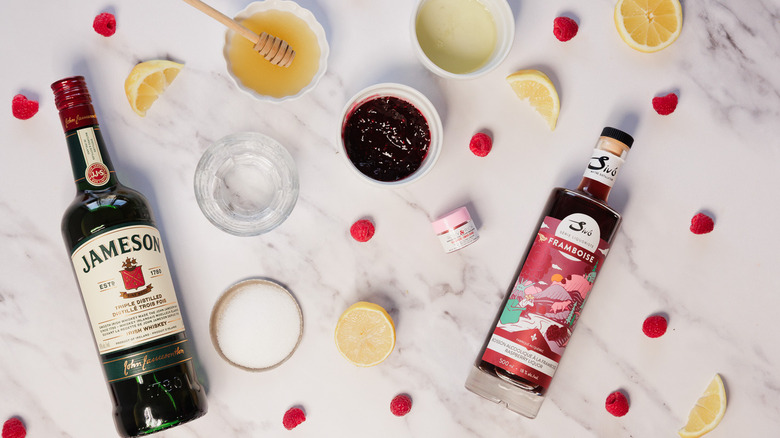- Combine the Scotch, lemon juice, raspberry liqueur, preserves, and honey simple syrup in a mixing glass.
