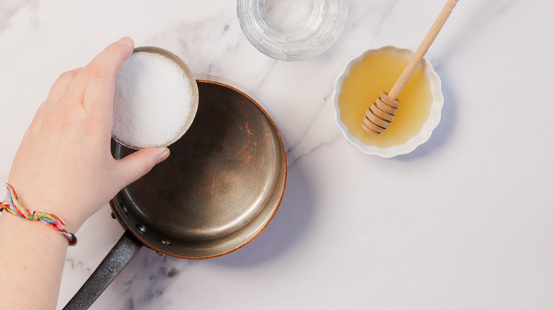 - Combine the water, honey, and sugar in small saucepan over medium heat.