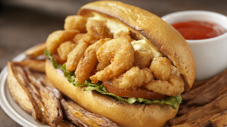 Alongside gumbo, hush puppies, and a slew of other beloved Cajun dishes, the po' boy is a Louisiana staple. Whether you make yours with roast beef or New Orleans' classic fried shrimp, the sandwich generally pairs your choice of a meat or seafood filling with lettuce, tomato, pickles, and mayonnaise. Those ingredients are then piled between layers of soft bread — a combination that often proves messy, with the tendency to squish and fall apart after just one bite. To combat this conundrum, celebrity chef Alton Brown recommends one simple fix: Tear out some of your bread's excess interior to create more room for your filling.