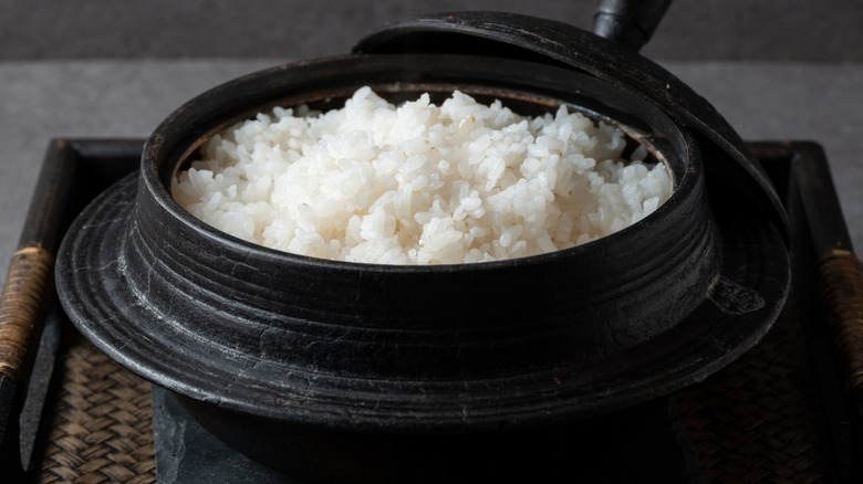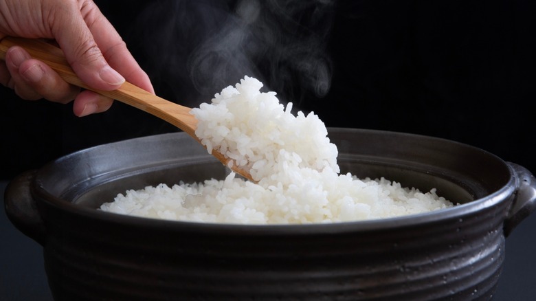 Any pot that's deep enough to contain a few cups of rice and water may seem like the best choice for cooking, but the material of your cookware is another important factor to consider. Reactive cookware is known to have an impact on food, altering components like its taste and color. Materials like aluminum, copper, and iron can release miniscule amounts of metal into food, leading to discoloration. Even the spoon you stir the grains with matters, as reactive metal utensils could be altering how your food tastes and looks. However, what you add to the rice determines whether the metal will yellow it.