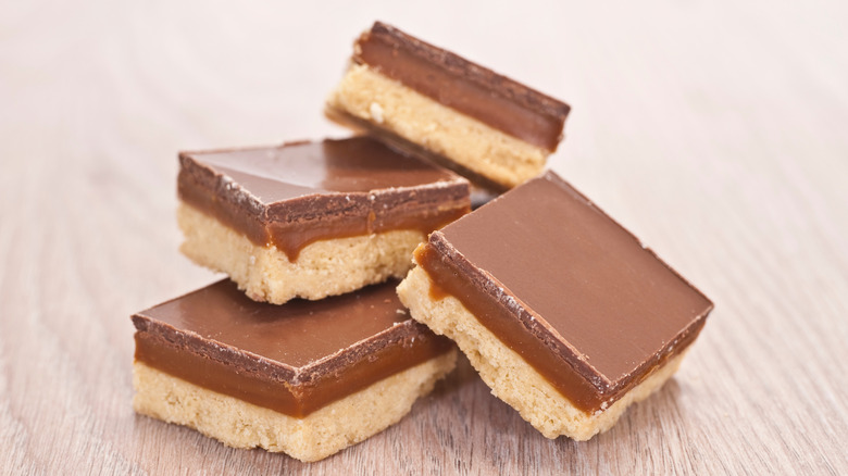 The slice has three components: the base, the caramel, and the topping. As the more widely recognized name millionaire's shortbread suggests, the base is indeed a buttery shortbread. Australian caramel slices often incorporate coconut into the base, though this is not as common in Americanized preparations of it. The caramel is made with butter, condensed milk, and a rich sweetener, like brown sugar or golden syrup. Finally, the topping includes dark chocolate and an oil-based product like vegetable oil or Copha. The shortbread is topped with the caramel and melted chocolate before it's left to set.
