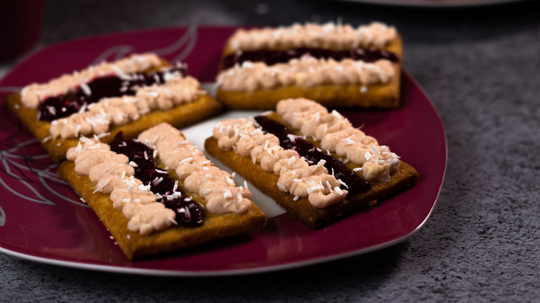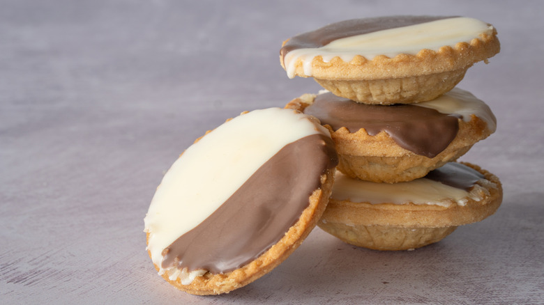 A lot of modern-day Aussies might not recognize neenish tarts by their name, but they'd certainly recognize them by appearance. The tart looks like a cookie with half brown and half white icing. But of course, it isn't a cookie. It's a shallow tart, cut to look like a disk. The tart is filled with a cream filling, made with sugar, milk, butter, gelatin, and vanilla. It's often topped with chocolate and vanilla icing, though some bakeries get funky with it and color it pink. There's sometimes even a layer of jam. It's the definition of sweet treat.