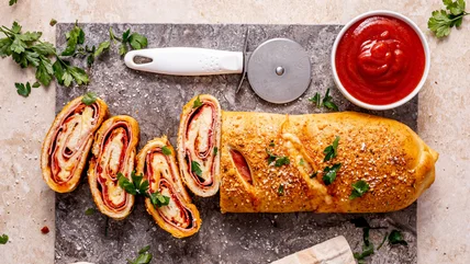Stromboli tends to freeze pretty well, but the quality of the dish when thawed depends on how it's stored. Allow the stromboli to cool down completely before slicing it up into one-sized portions. This way, thawing and reheating the turnovers will be faster, and the interior can get thoroughly heated. Exposure to cold freezer air will degrade the stromboli's texture, so make sure each slice is properly covered up. Tightly wrap each slice with both plastic wrap and aluminum foil before placing it in the freezer. This double layer is especially good for dairy-heavy dishes like cheesesteak stromboli since cheese doesn't always freeze well.