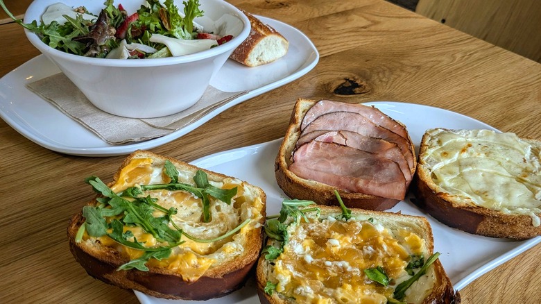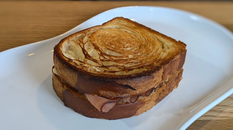 When you're craving a hearty meal on the go but aren't too keen on a greasy fast food burger or sad bag of gas station nuts, Panera Bread is your lighthouse in a sea of (frankly, too many) food options. The feel-good comfort food chain started its journey as a modest St. Louis bakery and, over the course of a few decades, transformed into a 2,000-plus-location behemoth found in just about every U.S. state. It's famous for serving soups in a bread bowl, vibrant salads, and downright addicting sourdough, but now there's a new contender for fan-favorite Panera dish: croissant toast sandwiches.