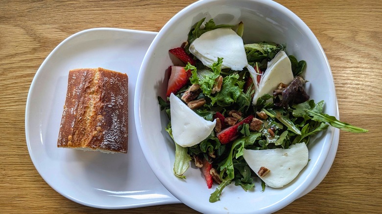 On paper, the Strawberry Caprese Salad is a spring-centric meal option that's hard not to love (although Panera is definitely stretching its definition of "caprese" here). Strawberries are a slightly unconventional sweet swap for tomatoes, but it's no secret that they work like a dream when paired with basil. However, the basil on Panera's new salad was a mere hint of bright, fresh flavor — it didn't offer the fragrant explosion of herbaceousness that I was hoping for. This was a pretty big letdown, especially considering that basil is the highlight of a caprese salad.