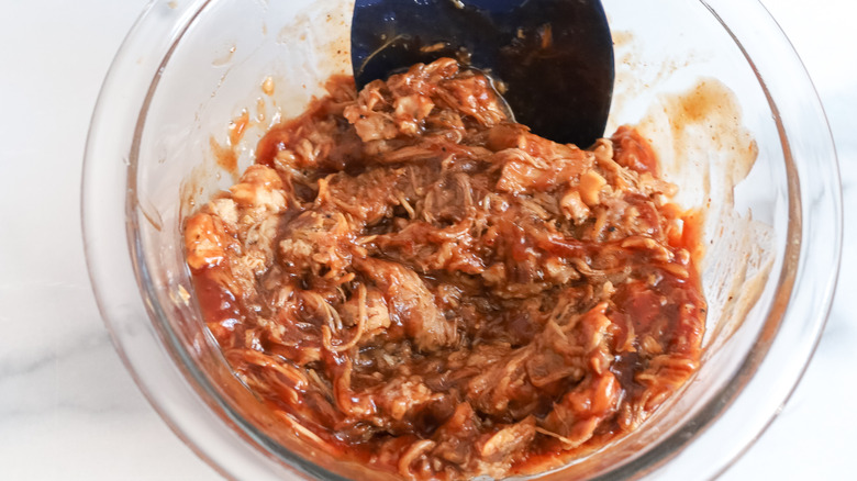 - In a small bowl, mix together the pulled pork and barbecue sauce until the pork is coated. Set aside.