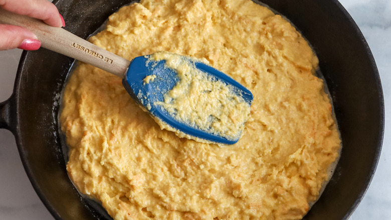 - Spread half of the cornbread batter in the bottom of the skillet.