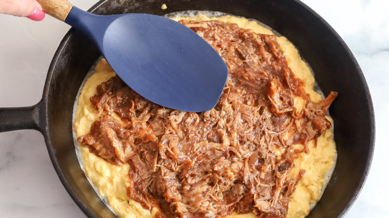 Meanwhile, she notes, "You could add in chopped jalapeños to make it spicy, or green onions for an additional flavor." If you want to skip the spice, diced bell peppers are a good option too. Pulled pork is a natural pairing with cornbread, but if it's not your favorite, Morone suggests pulled chicken or brisket instead. Finally, when it comes to plating up, she remarks, "You could add a layer of coleslaw on top before serving, or drizzle it with honey or hot sauce for a sweet or spicy twist." You might as well start baking because you'll want to try a few variations at the very least.