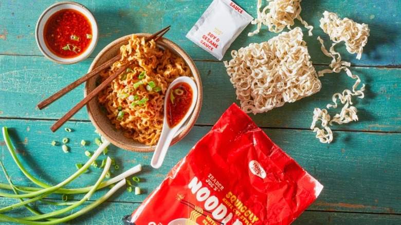 Trader Joe's popularity stems from its affordable prices and store-brand products that are as creative as they are delicious. The countless frozen, fresh, and packaged products under the Trader Joe's brand do a wonderful job at imitating many global cuisines. And we've found a way to combine three delicious and culturally diverse products into the most flavorful fusion cuisine. You can make birria ramen with Trader Joe's frozen birria, a few cups of broth, and Trader Joe's squiggly noodles.