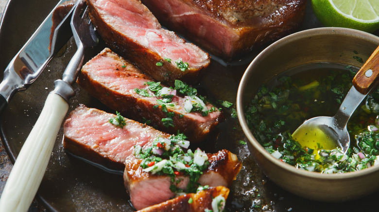 An easy chimichurri recipe makes a light and tangy sauce that Thivet notes is the "perfect balance to accentuate the flavor of the [charred] meat by adding freshness and a perfect amount of zing." The typical ingredients of this Argentinian sauce include olive oil mixed with fresh garlic, parsley, and cilantro, dried oregano, crushed red pepper flakes, red wine vinegar, salt, and pepper to taste. If you want to make quality steak frites at home, choosing a chimichurri sauce to top off your dish is the right way to go. Whether your go-to recipe is quick and easy or a more labor-intensive fresh chimichurri sauce, both will yield a complementary condiment.