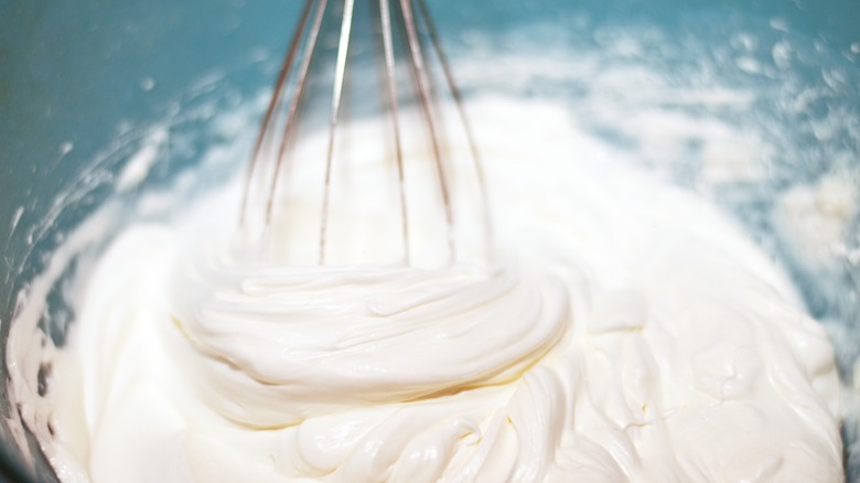 Julia Child's decades of experience in the culinary world meant that she probably trial-and-errored everything, including the best ways to make whipped cream. She understood the science behind beating eggs and whipping cream, which teaches us that the fluffiness we're accustomed to seeing comes from emulsifying, a process that destabilizes the fat molecules in heavy cream and combines it with the air pockets that come from mixing. Child advised that "you must incorporate as much air as possible" into whipped cream (Internet Archive), a process most easily controlled by hand whisking, not an electric beater. When you whip by hand, you can have a better feel for when the cream reaches the ideal consistency – not too runny but also not overbeaten.