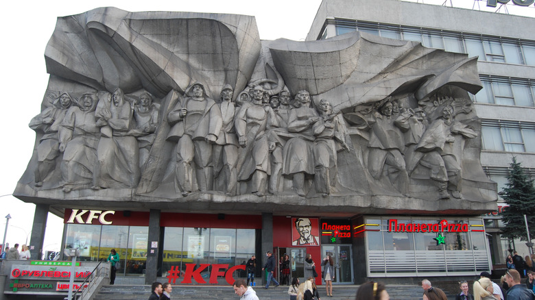 On the street named Pieramožcaŭ Avenue, which was once known as Victors' Avenue, a huge piece of art called Solidarity rises above the street. At present, the massive piece towers above a KFC. KFC franchises began popping up throughout the nation in 2015, but the sculpture was initially carved in the 1960s. The contrast is stark, as the Soviet mural is a clear representative of a socialist time, and the Western brand beneath it an obvious symbol of capitalism. You would be pressed to find a more Soviet fast food location. Aside from the commanding sculpture, the KFC is a typical one, with the same branding and colors you'd see at any other location.