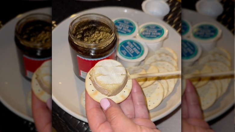 All you need is a package of brie bites, and you can make the savory s'mores of your dreams. Brie complements all kinds of fillings, so there's no exact rule on what will and won't work for your next batch of s'mores. If you're looking for inspiration, however, Stonewall Kitchen's Hot Pepper Jelly is a great option. It will boost the otherwise mild flavor of brie and bind the melted cheese to your crackers. Alternatively, you can make your savory s'mores slightly sweet. Try a layer of honey — which tends to be popular in baked brie recipes — or a light layer of fig jam. Fruit jams, jellies, and other spreads are by no means necessary, but will add even more flavor to your brie.