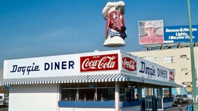 Ross, a former amateur boxer, was all about high-quality ingredients, which is what firmly established Doggie Diner in its customers' esteem, especially the chili cheese hot dog and hot pastrami sandwich. This grew the chain to around 30 restaurants by 1969, with most stores being open 24 hours, every day of the week. But it ended up being the cartoon-like dog heads that so endeared the public to the brand that paved the way for the chain's downfall. In the mid-'60s, San Fran zoning put out an ordinance prohibiting rotating signs, and at the same time, mainstream culture started shifting away from the Earth-harming plastic vibe and toward going natural.