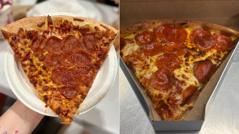 Sam's Club's pizza was pillowy and a little on the thick side. It reminded me of the type of crust you'd find at larger pizza chains like Pizza Hut or Papa John's. Pepperoni was the dominant flavor, as there was a fair amount of meat on the pizza. Although I initially liked the little pizza box the slice came in, I discovered that it was very flimsy and difficult to manage. It seemed my pizza might make a run for it with any jostling.