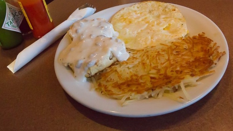One of the biggest issues with Denny's biscuits is a lack of flavor. They taste like they were made with the most basic ingredients and zero seasoning. There's no buttery richness, virtually no salt to balance the flavor, and absolutely no depth. If you're expecting a biscuit that nicely complements a plate of eggs or gravy, prepare for disappointment. The dryness makes them tough to swallow, and even drowning the biscuits in sausage gravy fails to improve the situation much, only leading to a tasteless mouthful.