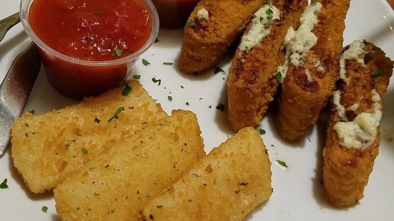 Personally, though, I felt the mozzarella was stale, chewy, and rubbery. While you anticipate biting into something decadent, what you're left with is a dense, flexible piece of cheese that tastes like plastic rather than milk. The breading does nothing, either. Instead of crispy and salty, the breading is thick, oily, and instantly soggy once it hit the table, with an off-putting and chewy texture, as well. Batches also tend to have a somewhat stale and unpleasant aftertaste, as though they'd been sitting too long under a heat lamp, or the oil was old.