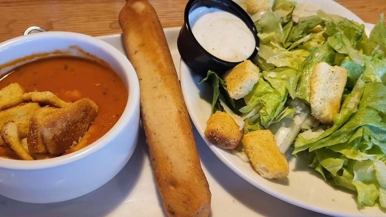 Conversely, even if Olive Garden doesn't serve you broccoli that's nearly raw, you may still end up with an over-steamed side dish. You may be met with a side of broccoli that's a sickly shade of a dull, olive green (as we've experienced), with a grossly soft texture and no remaining natural flavor. Without any seasoning or a proper balance of cooking time, this side dish is no complement to your pasta or protein, and you might as well order a salad if you want a vegetable side at Olive Garden.