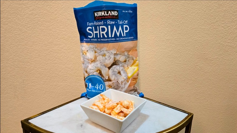 Costco's store brand Kirkland Signature offers a variety of raw and cooked peeled and deveined shrimp, prepared shrimp products, and wild-caught red Argentine shrimp. These jumbo, tail-off, peeled, and deveined red shrimp from Argentina are a must-buy seafood from Costco, as they are sweet, plump, meaty, and tender.