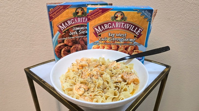 Though slightly sweeter than I was expecting due to the inclusion of sugar, the Jammin' Jerk Shrimp also has heat with a spicy Jamaican seasoning. Margaritaville's Key West chili citrus shrimp was buttery and creamy with a rich lemon sauce. I did not taste the heat expected in a chili sauce. Instead, the citrus was the star here. To complete the meal, I added pasta, and there was enough sauce to dress the entire dish perfectly.