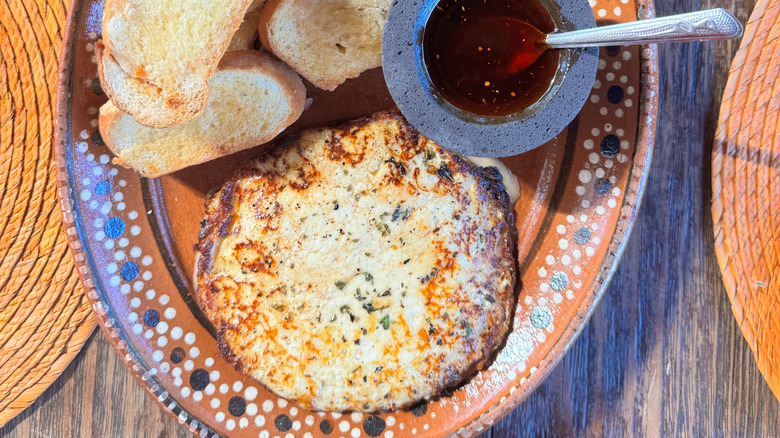 Delivered by the Spanish, who traded with the Dutch through ports in the Yucatán, this form of cheese has remained immensely popular all across Mexico following the end of colonial rule and beyond. That said, it's especially popular in the Yucatán peninsula, where it is highlighted in an especially unique way: Queso relleno is a dish in which queso de bola is hollowed out and filled with any number of things, from pork picadillo to almonds, capers, and a host of spices. After filling, the cheese is poached until it is slouching, soft, and sliceable with a fork.