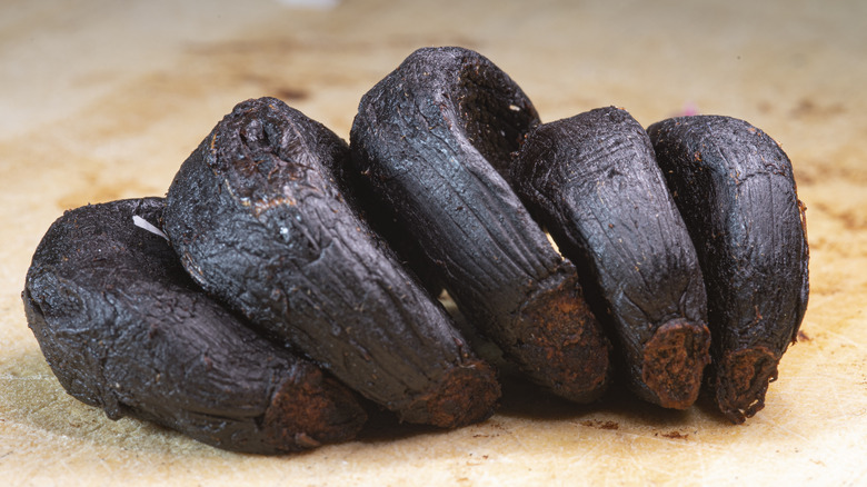 There are several different black garlic products that you may want to consider adding to your next batch of veggie or bean burgers. Not only can you buy whole heads of black garlic, but you can also buy black garlic powder and black garlic puree — the latter two of which tend to mix more readily into the veggie burger patty than the whole cloves. Black garlic pairs well with an array of different veggies since it has a slightly sweet component; it's especially delicious paired with broccoli, carrots, and squash-based patties.