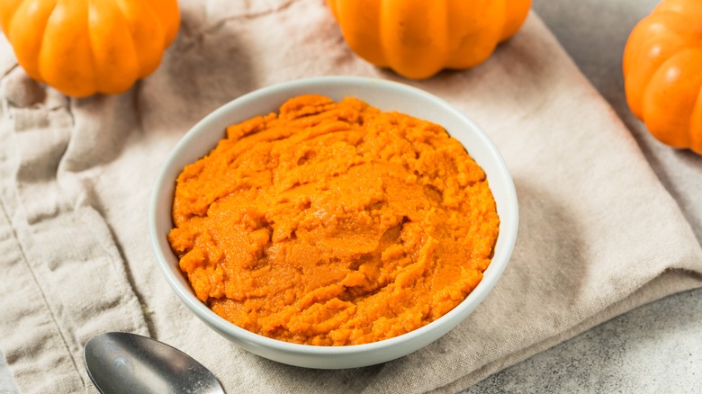 You'll only need to use between ½ and ¾ of a cup of pumpkin puree for every four or so patties. Stir it into the batter with the rest of your ingredients and spice accordingly; ancho chili, paprika, and cumin can add a subtle and savory warmth, while sage and rosemary will put the flavor of the squash center stage.