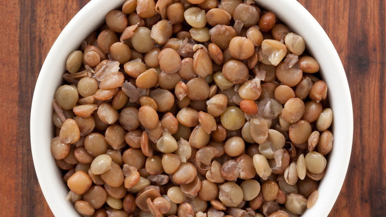 Lentils, like beans, are earthy, but they don't have as much as a toothsome bite. Making a burger recipe with lentils instead of beans will give you a little bit gentler foray into the world of veggie patties. You'll want to use dried lentils for your recipe, cooked according to the package directions. While canned lentils are easy to just pour into your food processor, they tend to come out mushy — and that texture will be imparted onto your finished burger. You'll also want to stock up on binders, like crackers, oatmeal, or breadcrumbs, to help hold your patties together, as lentils lack that adhesive quality.