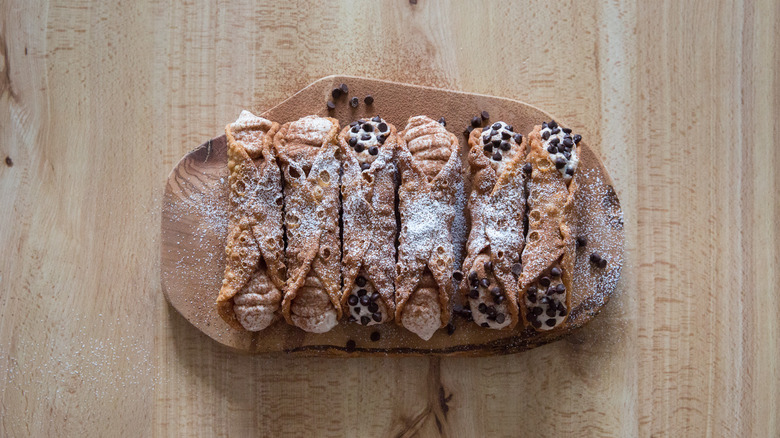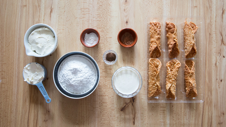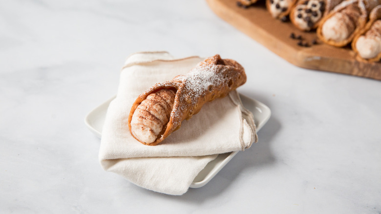 Standard cannoli have a fried shell made from flour, lard, sugar, and wine, and a filling made from ricotta and sugar. Sometimes the inside of the shell is lined with melted chocolate to keep it crispy. Keep in mind there's one essential ingredient to Sicilian cannoli — sheep's milk ricotta, which is common in Italy, but not in the United States. It's rich and dense and more flavorful than cow's milk ricotta, and has an extra tang. Cannoli filling ingredients can vary; for example, some people add vanilla, chocolate chips, candied fruit, or chopped nuts.